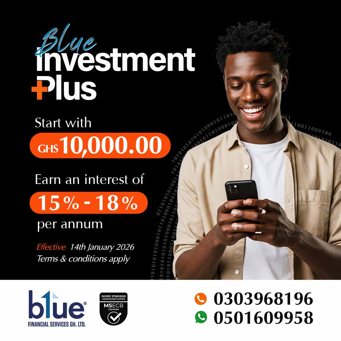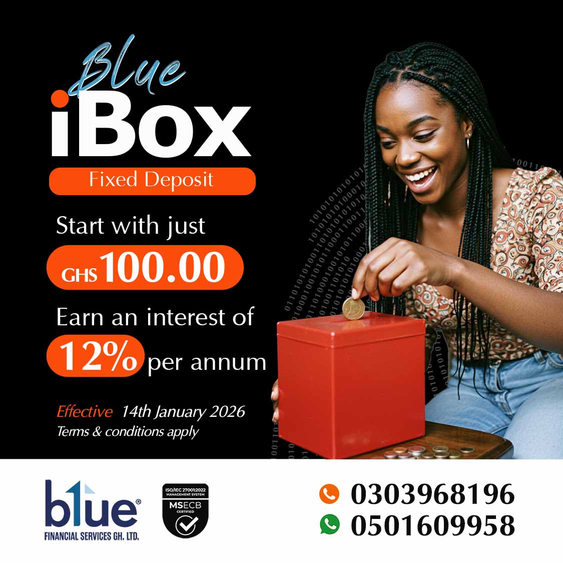 Grow your wealth with Blue Fixed Deposits, backed by Bank of Ghana regulation for safety and stability. Enjoy competitive returns with flexible investment options tailored to your needs.